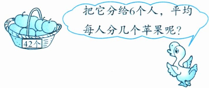 已知有$42$个苹果,要分给$6$个人,求平均每人分几个苹果,就是把$42$平均分成$6$份,求每份是多少,用除法计算,列式为$42÷6$。