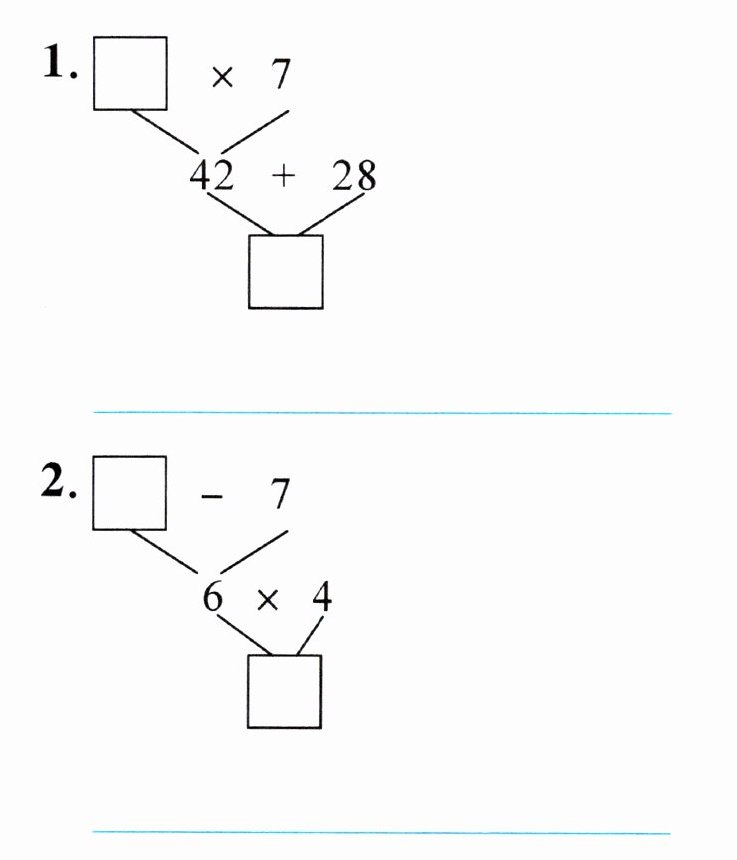1. □=6,□=70,综合算式:6×7+28=70 2. □=13,□=24,综合算式:(13-7)×4=24