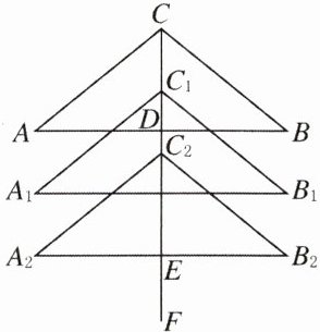 3. 小温同学在美术课上将$\triangle ABC$通过平移设计得到“一棵树”,已知底边$AB$上的高$CD$为$5\mathrm{c}\mathrm{m}$,沿$CD$方向向下平移$3\mathrm{c}\mathrm{m}$到$\triangle A_{1}B_{1}C_{1}$的位置,再经过相同的平移到$\triangle A_{2}B_{2}C_{2}$的位置,下方树干$EF$长为$4\mathrm{c}\mathrm{m}$,则树的高度$CF$长为(