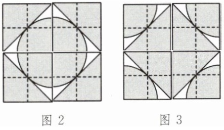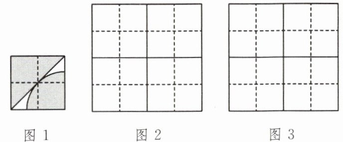 18. 小姝家最近买了一种如图 $1$ 所示的瓷砖. 请你用 $4$ 块如图 $1$ 所示的瓷砖拼铺成一个正方形地板,使拼铺的图案成中心对称图形,请在图 $2$、图 $3$ 中各画出一种拼法. (要求:①两种拼法各不相同;②为节约答题时间,方便扫描试卷,所画图案阴影部分用黑色斜线表示即可;③弧线大致画出即可)