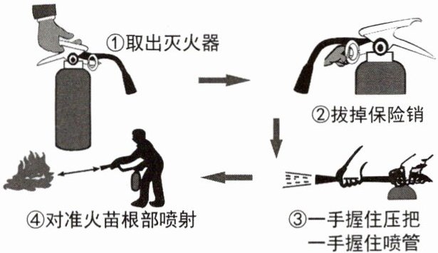 6. 首先,取出二氧化碳灭火器;接着,拔掉保险销;然后,一只手握住喷管(不要握住喇叭筒外壁或金属连接管),另一只手握住压把;最后,对准火苗根部喷射(使用时灭火器不能倒置)。