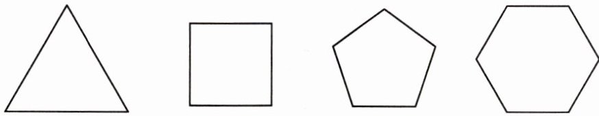 综上,答案依次为:等边三角形$\boldsymbol{3}$条对称轴;正方形$\boldsymbol{4}$条对称轴;正五边形$\boldsymbol{5}$条对称轴;正六边形$\boldsymbol{6}$条对称轴。