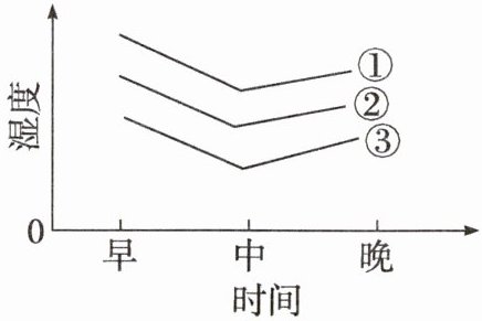 14. 某兴趣小组选取了校园内三个不同的地点,在早、中、晚三个时间点进行了空气湿度的测量,并绘制成如图。其中,裸地、草地、灌木丛所对应的曲线依次是(