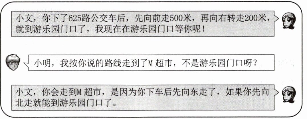 解:小文从$M$超市走到游乐园门口的路线为:先向左转(向西)走$200$米,再向后转(向南)走$500$米。