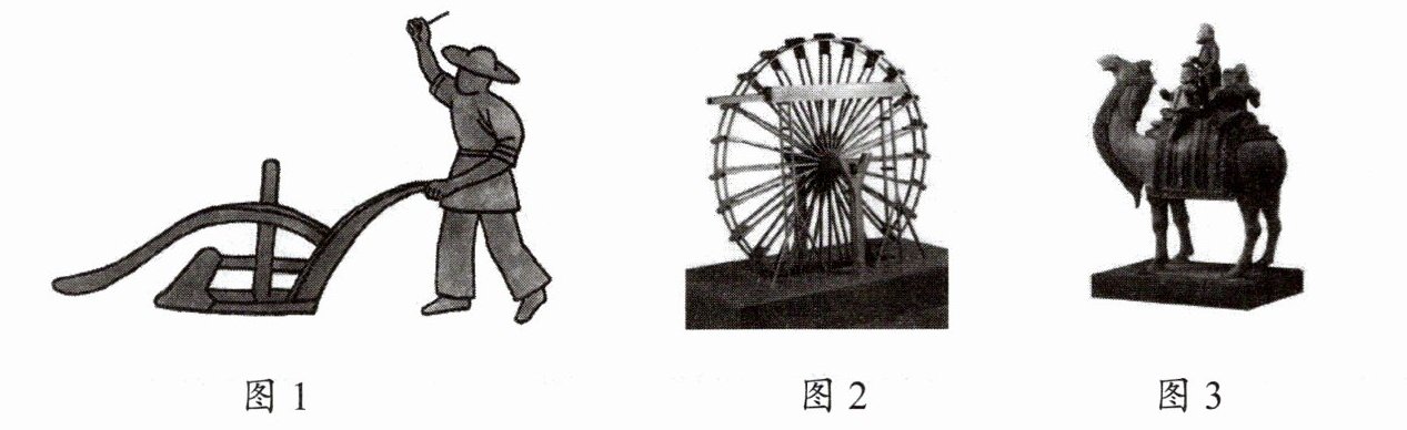 2. 图1:曲辕犁。图2:筒车。图3:唐三彩。