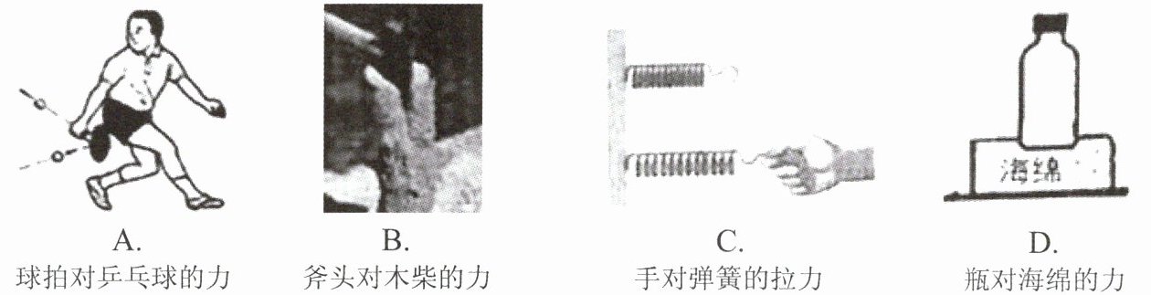 D选项:瓶对海绵的力,使海绵被压缩,形状发生改变。