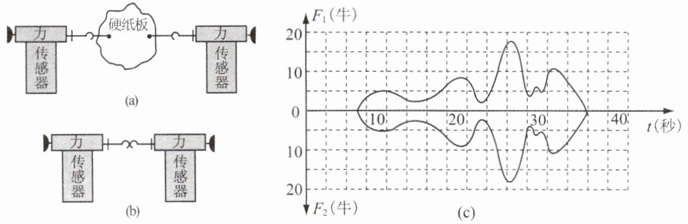 (2)图(c)是该组同学正确进行实验,在计算机上得到的实验图线(纵轴分别显示 $ F_1 $ 和 $ F_2 $ 的大小,横轴表示时间 $ t $).请依据相关信息,写出关于相互作用力的大小和相互作用力与时间的关系的两条结论.