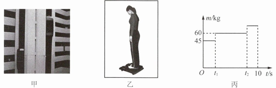 (2)已知小勇的实际质量为60kg,由图像可知,在0∼$t_1$阶段,小勇的质量为45kg,此时处于失重状态,失重并不是失去重力了,而是物体对支持物的压力或者对悬挂物的拉力小于物体的重力,这是因为物体具有向下的加速度,秤台对小勇的支持力与小勇重力不是一对平衡力。