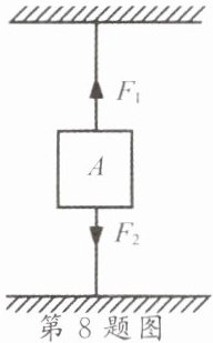 8. 如图所示,重力为6N的木块A被沿竖直方向的两根橡皮筋拉住处于静止状态,已知木块下面橡皮筋的拉力$F_{2}= 4N$.剪断木块下面橡皮筋的瞬间(木块未动),木块A受到的合力为