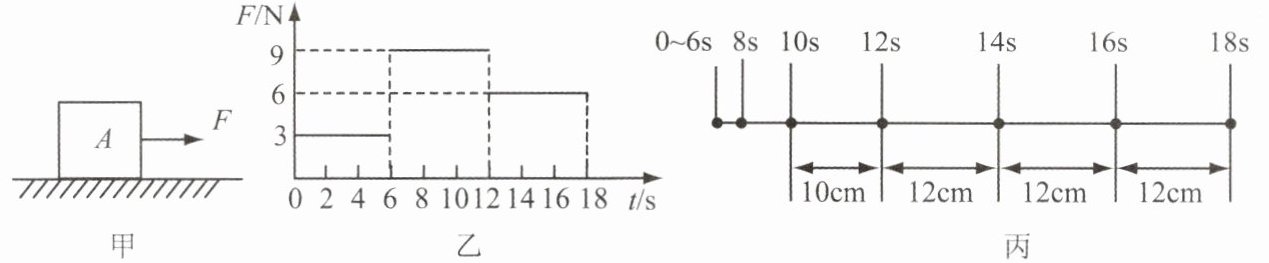 9. 物块A静止在粗糙程度均匀的水平桌面上,如图甲所示,物块A受到水平拉力F的作用,拉力F随时间t变化关系如图乙所示.小萍从$t= 0$开始,每隔2s记录一次物块A的位置(用“·”表示物块A),如图丙所示,6s~12s内物块所受的摩擦力为