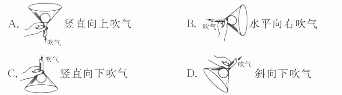2. 小明采用“向漏斗口吹气,观察乒乓球状态”的方法来探究流速对流体压强的影响.以下方案不合理的是 (