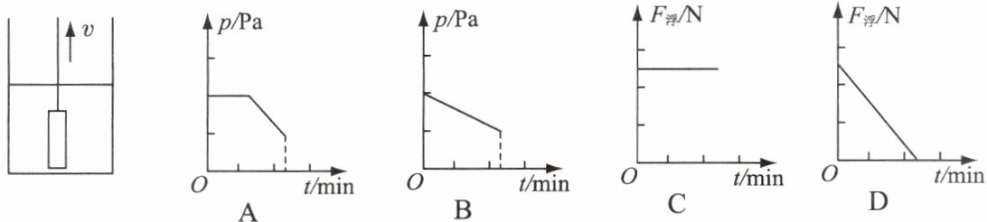 6. 如图所示,将一圆柱体从水中匀速提起,直至其下表面刚好离开水面.用p表示容器底受到水的压强,$F_{浮}$表示圆柱体受到水的浮力,它们随时间t变化的大致图像正确的是 (