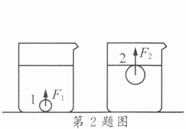 2. 小球2在两种状态下都处于漂浮状态,说明它的浮力等于重力。加入盐后,盐水的密度增加,但小球2依然漂浮,浮力不变,因此 $F_{2}' = F_{2}$。