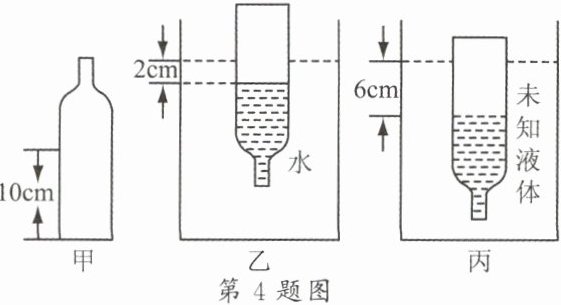 4. 一个质量为80g的圆柱形瓶身的空玻璃瓶,内装10cm高的水密封后放在水平地面上,如图甲所示,再将玻璃瓶分别倒置在盛有水和某种未知液体的容器中,静止后,瓶内、外液面的高度差如图乙和图丙所示($ρ_{水}= 1×10^{3}kg/m^{3}$,$g= 10N/kg$,瓶壁厚度忽略不计).下列说法正确的是 (