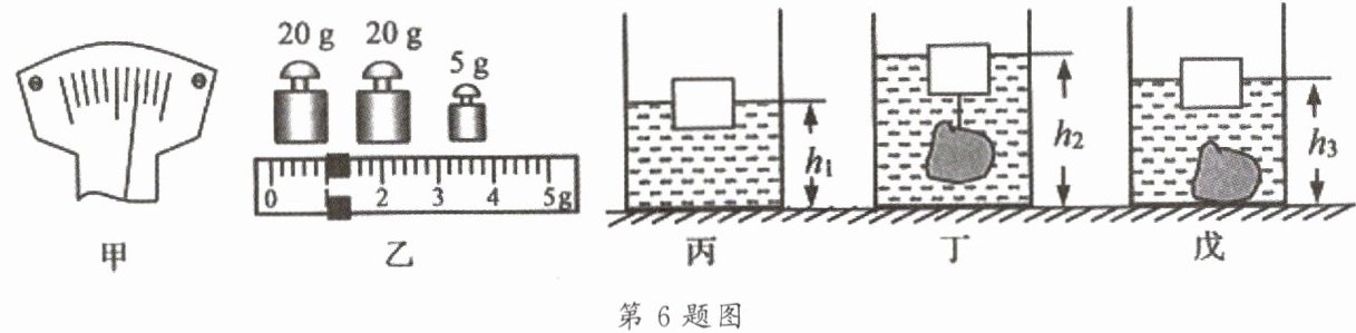 (5)设容器底面积为S。丙图中木块漂浮,浮力等于木块重力;丁图中石块和木块整体漂浮,浮力等于总重力,相比丙图,增加的浮力等于石块重力,增加的排开水体积为S(h₂-h₁),所以石块重力G=ρ水gS(h₂-h₁),则石块质量m=ρ水S(h₂-h₁)。戊图中石块沉底,排开水体积等于石块体积,即V=S(h₃-h₁)。所以石块密度ρ石=m/V=ρ水(h₂-h₁)/(h₃-h₁)。