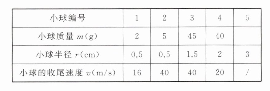 (2) 当小球达到收尾速度时做匀速直线运动,此时小球受到的空气阻力与重力平衡,即二力平衡条件,所以最大空气阻力等于小球重力。编号1的小球质量为5g,即0.005kg,重力G=mg=0.005kg×10N/kg=0.05N,故空气阻力为0.05N。