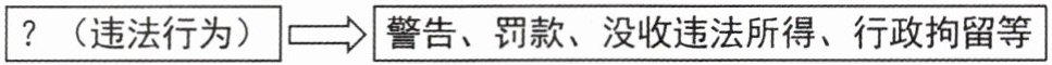 【解析】:本题考查违法行为的分类及法律责任。图示中违法行为对应的法律责任是警告、罚款、没收违法所得、行政拘留等,这些属于行政处罚,由此可判断“?”处应填写行政违法行为。