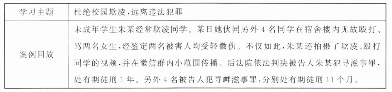 (2)①树立法律意识,学习法律知识,明确法律后果;②自觉抵制不良诱惑,杜绝欺凌等不良行为;③学会控制情绪,尊重他人权利,不侵犯他人合法权益;④谨慎交友,避免参与违法违纪活动;⑤主动接受家庭、学校和社会的监督,及时纠正错误行为。
