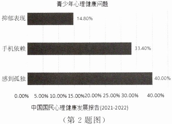 从图表中可以看到,青少年心理健康问题中,感到孤独占40.00%,手机依赖占33.40%,抑郁表现占14.80%,这些数据表明部分青少年的心理健康问题较为严重,不容忽视,①说法正确;虽然青春期可能会出现一些心理问题,但这些心理问题如果不加以重视和解决,可能会对青少年的成长产生不良影响,不能认为不用大惊小怪,②说法错误;面对青春期的矛盾心理,青少年要学会自我调节,如通过与他人倾诉、参加体育活动等方式来缓解心理压力,③说法正确;独立意识增强是青春期正常的心理特点,并不是造成心理不健康的主要原因,④说法错误。综上,①③正确。