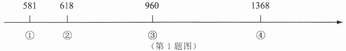 【解析】:观察年代标尺,①处对应的时间是581年。结合所学知识,581年,杨坚夺取北周政权,建立隋朝,定都长安,杨坚就是隋文帝。618年唐朝建立,960年北宋建立,1368年明朝建立,均与①处时间不符。所以①处建立的是隋朝。