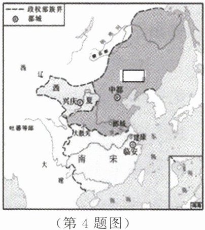 4.右图是南宋与少数民族政权对峙图,图中方框内应填的少数民族政权是 (