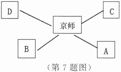 【解析】:伊犁将军是清朝乾隆帝平定准部和回部之后设立的新疆地区名义上的最高军政长官 ,其管辖范围包括巴尔喀什湖以东、以南,天山南北两路,东至哈密、西至葱岭及帕米尔等地区。从图示来看,京师为中心,A大致处于新疆地区位置。B、C、D所处位置不符合伊犁将军管辖区域。