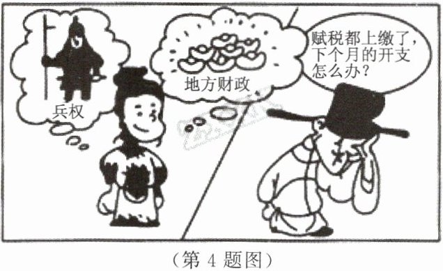 【解析】:图片中左侧人物思考“兵权”,右侧人物因“赋税都上缴”而发愁开支,这反映了北宋削弱地方权力的措施。北宋为加强中央集权,采取了收精兵(集中兵权)、削实权、制钱谷(地方赋税大部分上缴中央)等措施,与图中信息相符。A项节度使是唐朝设置的,北宋已削弱其权力;C项崇文抑武是重视文官、抑制武将,图中未体现;D项改革科举制度主要涉及选官,与兵权、财政集中无关。