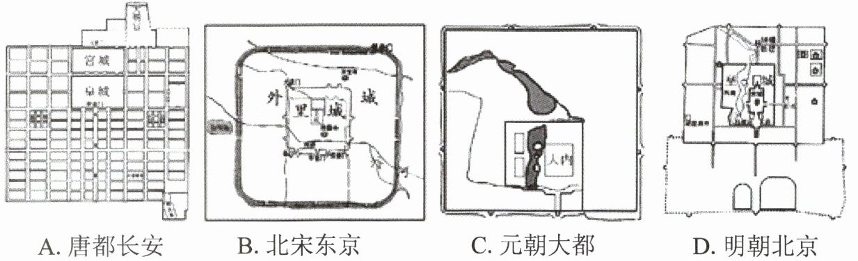 【解析】:题目中诗句描述了城市中瓦子(瓦舍、瓦肆)内讲评书的场景,瓦子是北宋东京城内娱乐兼营商业的场所。A选项唐都长安的布局较为规整,坊市界限分明,商业活动有严格的时间和空间限制,与诗句中瓦子这种娱乐商业场所的描述不符;C选项元朝大都虽也有城市商业活动,但诗句所描绘的瓦子讲评书场景更典型地体现在北宋东京;D选项明朝北京的城市布局和商业娱乐活动形式与北宋东京的瓦子场景也有差异。而B选项北宋东京的瓦子正是城市生活中娱乐商业繁荣的体现,与诗句内容相契合。
