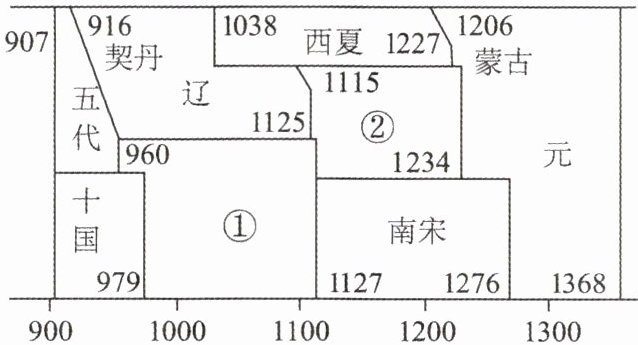 (1) 观察材料一《中国历史纪年表》,960年建立的政权①是北宋,其建立者是赵匡胤(宋太祖)。1115年建立的政权②,结合所学可知是金,建立民族为女真族。从图中多个政权并立(辽、北宋、西夏、金、南宋等)到元朝统一,可见宋元时期的时代特征是民族政权并立与民族交融,最终走向统一。