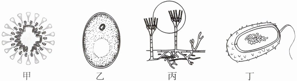 (1)图中甲是病毒,乙是酵母菌(真菌),丙是青霉(真菌),丁是细菌。病毒没有细胞结构,主要由蛋白质外壳和内部的遗传物质组成。而真菌和细菌都有细胞结构,所以甲与乙、丙、丁在细胞结构上的主要区别是甲无细胞结构。