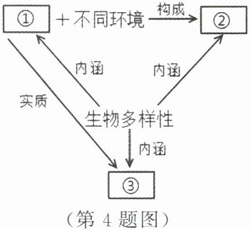 【解析】:生物多样性通常包括三个层次:基因多样性、物种多样性和生态系统多样性。分析概念图可知,③是生物多样性的内涵之一,且①和“不同环境”共同构成②,②也是生物多样性的内涵之一。基因多样性(①)是生物多样性的实质,不同物种的基因库不同,同一物种内也存在基因差异。物种多样性(②)是指一定区域内生物种类的丰富程度,而物种的生存依赖于特定的环境,因此基因多样性(①)与不同环境结合构成物种多样性(②)。生态系统多样性(③)是指生物圈内生物群落、生存环境以及生态过程的多样性,它是生物多样性的最高层次,涵盖了物种和基因在不同生态系统中的分布和相互作用,所以生物多样性的内涵包括生态系统多样性(③)。综上,①为基因多样性,②为物种多样性,③为生态系统多样性。