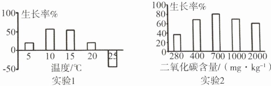 11. 海带的生长与其生活环境密切相关。某科研小组在实验室做了两个实验(实验1和实验2)探究温度或二氧化碳对海带生长率(指实验前后,海带体内物质增加的比率)的影响。请分析实验1数据(25℃时海带腐烂,所以生长率为负值),回答下列问题。