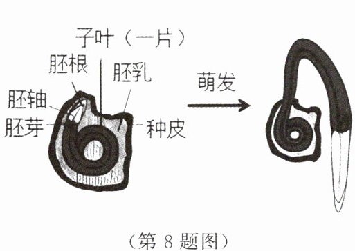 8. 如图是洋葱种子的结构及萌发过程。下列叙述错误的是(