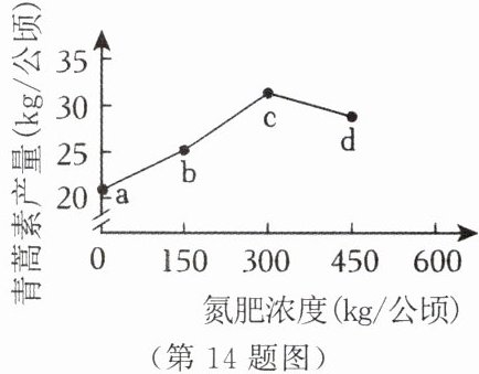 14. 为找到提高青蒿素(可从黄花蒿中提取)产量的方法,科研人员开展“探究氮肥对青蒿素产量的影响”的活动,结果如图。下列叙述正确的是 (