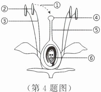【解析】:由图可知,①是柱头,②是花药,③是花丝,④是花柱,⑤是子房壁,⑥是胚珠。