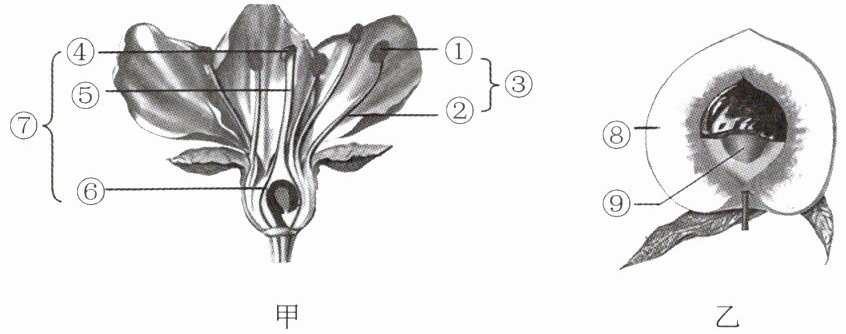 A选项:桃花的主要结构包括雄蕊和雌蕊,图甲中③是雄蕊(包括①花药和②花丝),⑦是雌蕊(包括④柱头、⑤花柱和⑥子房),桃花的主要结构是③和⑦,而不是③和⑥,所以A选项错误。