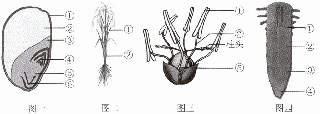 【解析】:由图可知,图一是果实结构,其中①是果皮和种皮,②是胚乳,③是子叶,④是胚芽,⑤是胚轴,⑥是胚根;图二是植株,其中①是叶,②是茎;图三是花蕊结构,其中①是花药,②是花丝,③是子房;图四是根尖结构,其中①是成熟区,②是伸长区,③是分生区,④是根冠。