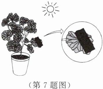 7.探究“绿叶在光下制造有机物”的实验中,将天竺葵暗处理后,用黑纸片遮盖叶片上、下两面,放置在阳光下(如下图)。此实验设置的变量是(