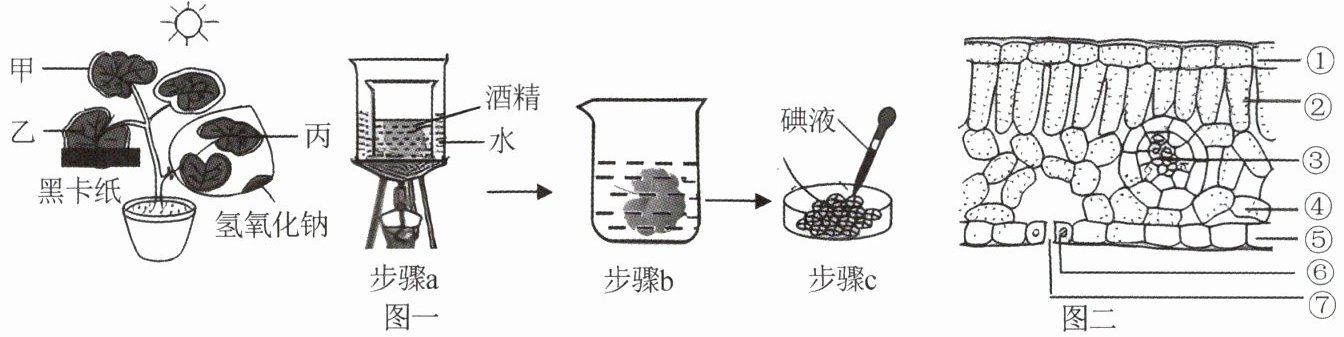 (4)叶片乙的见光部分能进行光合作用制造淀粉,淀粉遇碘变蓝,所以呈蓝色;遮光部分不能进行光合作用,没有淀粉生成,所以呈黄白色,由此可得出光是光合作用的条件。叶片甲处于正常环境中有二氧化碳,叶片丙所在装置中有氢氧化钠吸收二氧化碳,变量是二氧化碳,所以叶片甲和叶片丙形成对照可探究二氧化碳是光合作用的原料。