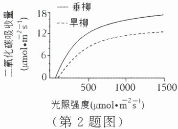 2. 垂柳和旱柳是常见的绿化树种,园林工作者对垂柳和旱柳的光合作用进行了研究,结果如图。下列叙述正确的是 (