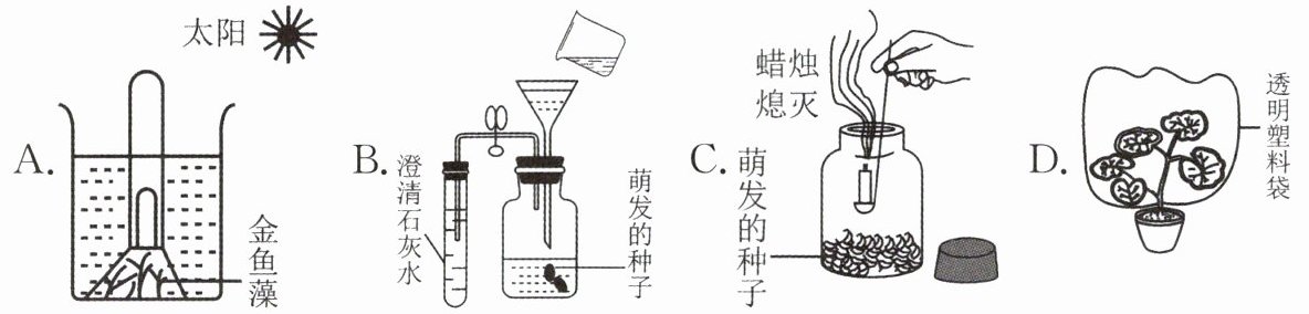 C装置:萌发的种子进行呼吸作用会消耗氧气。实验前若将装置密封一段时间,种子消耗氧气后,瓶内氧气减少。此时伸入燃烧的蜡烛,蜡烛因缺氧而熄灭,能直接证明呼吸作用消耗了氧气,C符合。