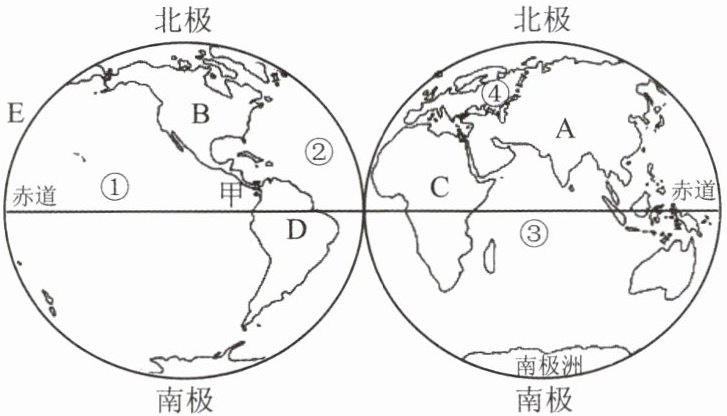 (3)甲是巴拿马运河,它沟通的大洋①位于美洲西部,是太平洋;②位于美洲东部,是大西洋;③位于非洲东部,是印度洋。