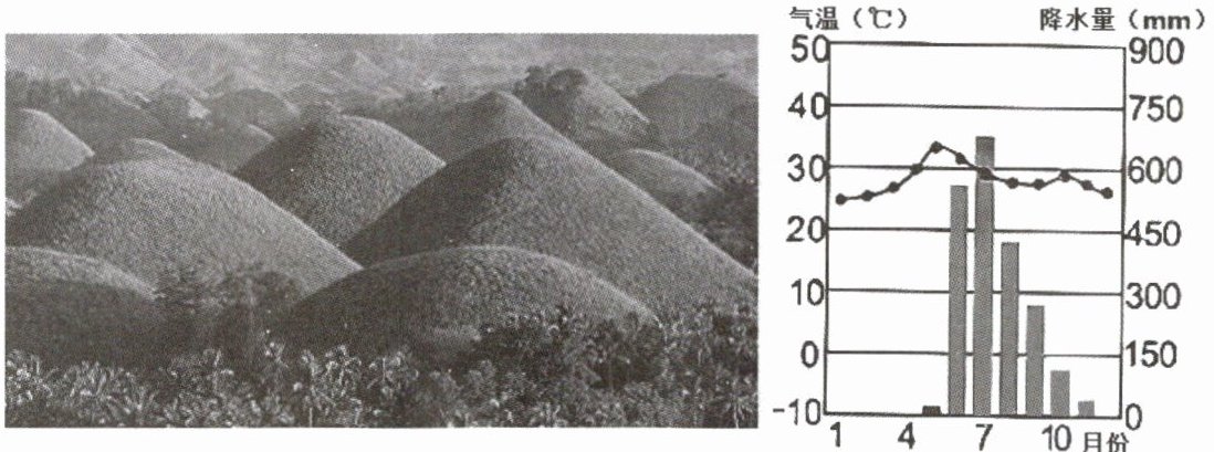 菲律宾薄荷岛中部丘陵上的草在雨季时为绿色,旱季时被炎热的太阳晒干变成咖啡色,酷似巧克力,国此得名“巧克力山”。下图为薄荷岛的气温和降水量图,读图完成13~14题。