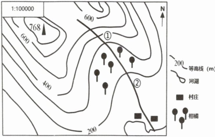 (4)图中等高距为200米,柑橘林位于200米等高线和400米等高线之间,所以海拔范围为200-400米。柑橘喜湿润但不能积水,此处等高线向海拔低处凸,为山脊(或山坡),地势有一定坡度,便于排水,不会积水,同时靠近河流,能满足对水分的需求。