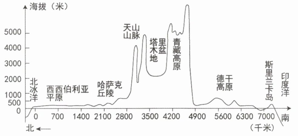【解析】:1. 结合剖面图可以看出,亚洲中部地势高,有青藏高原等众多高大地形区,四周地势相对较低,所以亚洲的基本地势特征是中部高四周低。
