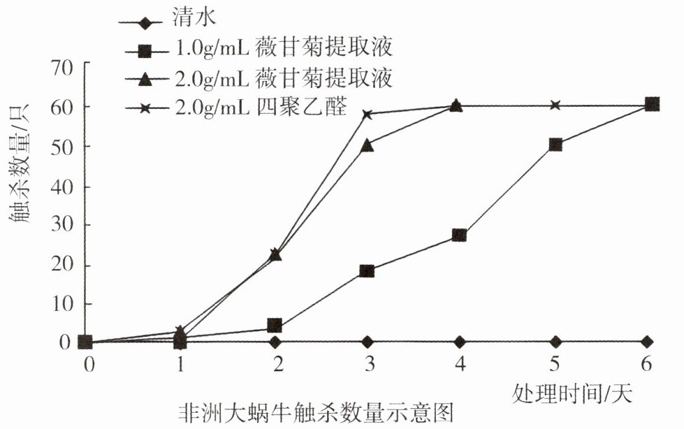 (3)观察图示,2.0g/mL四聚乙醛在第3天时触杀数量约为60只(接近60只)。2.0g/mL薇甘菊提取液在第4天时触杀数量达到60只左右,所以连续4天喷洒2.0g/mL的薇甘菊提取液才可以达到喷洒2.0g/mL四聚乙醛3天时的效果。题目中提到四聚乙醛“有一定毒性”,所以不建议喷洒四聚乙醛的原因是它有一定毒性,可能会对环境或其他生物造成危害。