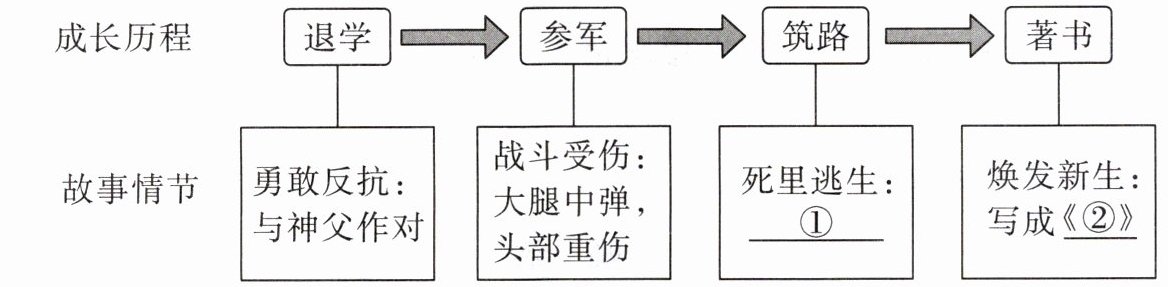 (1)下图概括了保尔的成长历程,请你根据小说内容在横线上填入相应的情节。