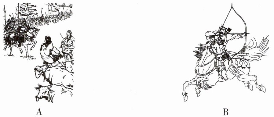 图,理由:首联、颔联中“日”“狐关”“危楼”“广漠”“长城”等,描绘了雄浑壮阔的边塞图景;颈联中“拂剑”“弯弧”,展现了一位卫国杀敌、豪气万丈的勇士形象。图B中的画面符合本诗的内容与意境。