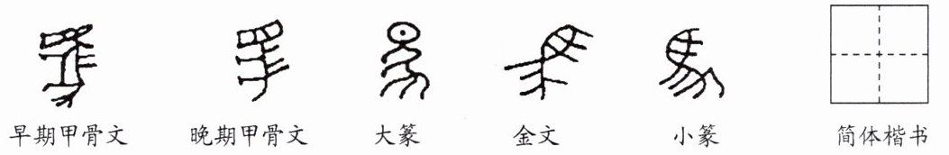 (1)【魅力汉字】草隶篆行,异彩纷呈,绽放出中国文化独特的艺术魅力和韵味。下面是一个汉字的演变过程,请根据前几个字形将其简体楷书写在田字格内,并总结出汉字从早期甲骨文到简体楷书的演变规律。