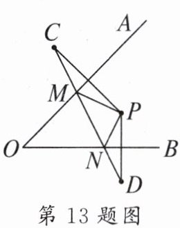 13. 如图,点P关于OA,OB的对称点分别为C,D,连接CD,交OA于点M,交OB于点N,连接PM,PN。若$CD= 18cm$,则$△PMN$的周长为